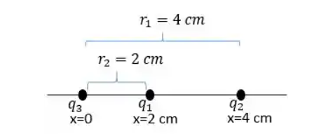 - Distância entre q_1 e q_2 (r_2) = 4 \text{ cm} = 0,04 \text{ m}