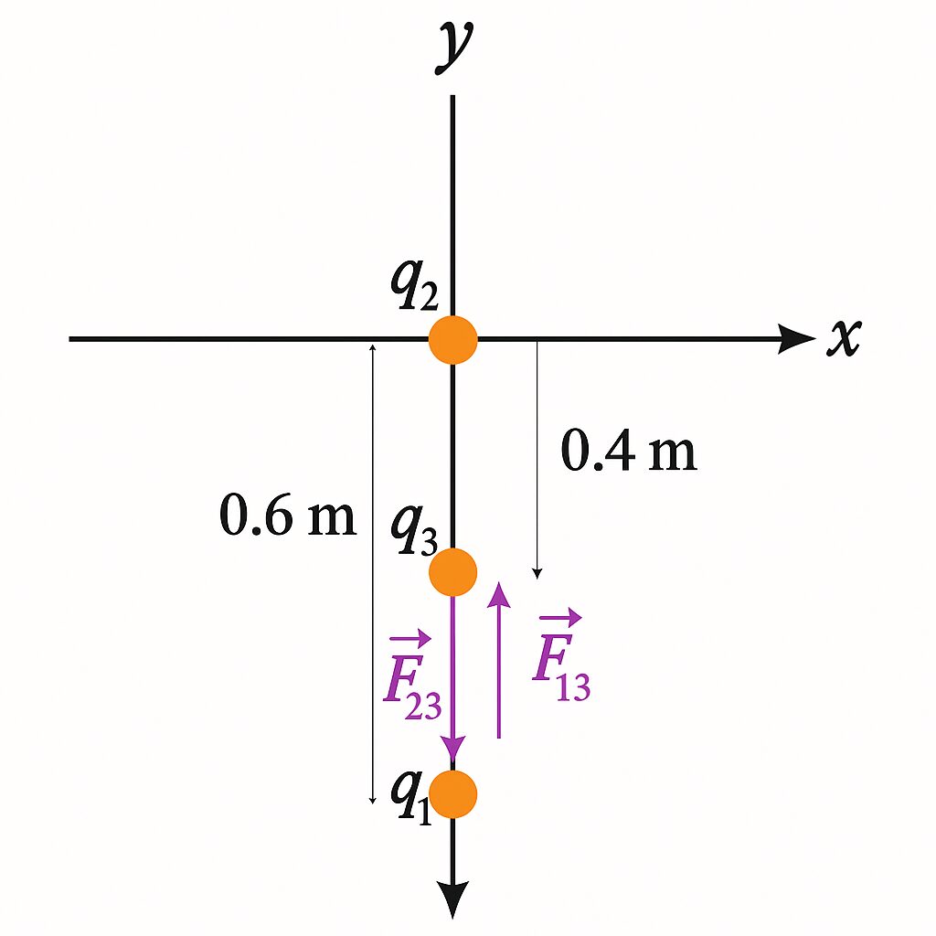 r_{13} = |y_3 - y_1| = |-0,400 - (-0,600)| = 0,200 \text{m} F_{13} = k \cdot \dfrac{|q_1 \cdot q_3|}{r_{13}^2} = (9 \times 10^9) \cdot \dfrac{|(-1,50 \times 10^{-9}) \cdot (5,00 \times 10^{-9})|}{(0,200)^2} F_{13} = (9 \times 10^9) \cdot \dfrac{7,50 \times 10^{-18}}{0,0400} = (9 \times 10^9) \cdot (1,875 \times 10^{-16})F_{13} = 1,6875 \times 10^{-6} \text{N} (direção -y)