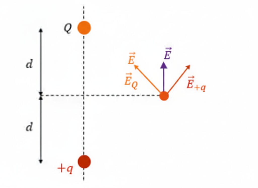 Sinal: O campo elétrico no ponto P aponta para cima. A carga +q é positiva, portanto seu campo elétrico em P é radial e se afasta dela. Como P está diretamente acima de +q, o campo gerado por +q em P aponta verticalmente para cima.