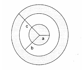 Uma casca esférica de raio interno b e raio externo c, uniformemente carregada com densidade de carga volumétrica ( \rho ), envolve uma esfera concêntrica de raio a, também carregada uniformemente com a mesma densidade (fig.).