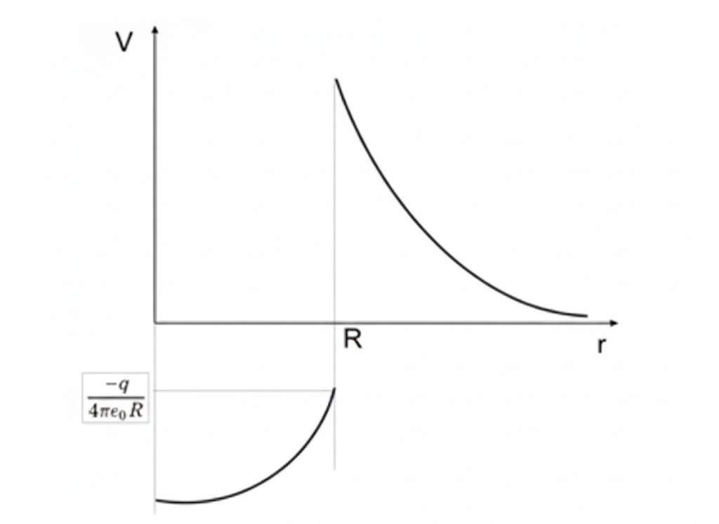 - Para r > R: V(r) decai como 1/r, partindo de V(R) = \dfrac{q}{4\pi\epsilon_0 R} e tendendo a zero no infinito.