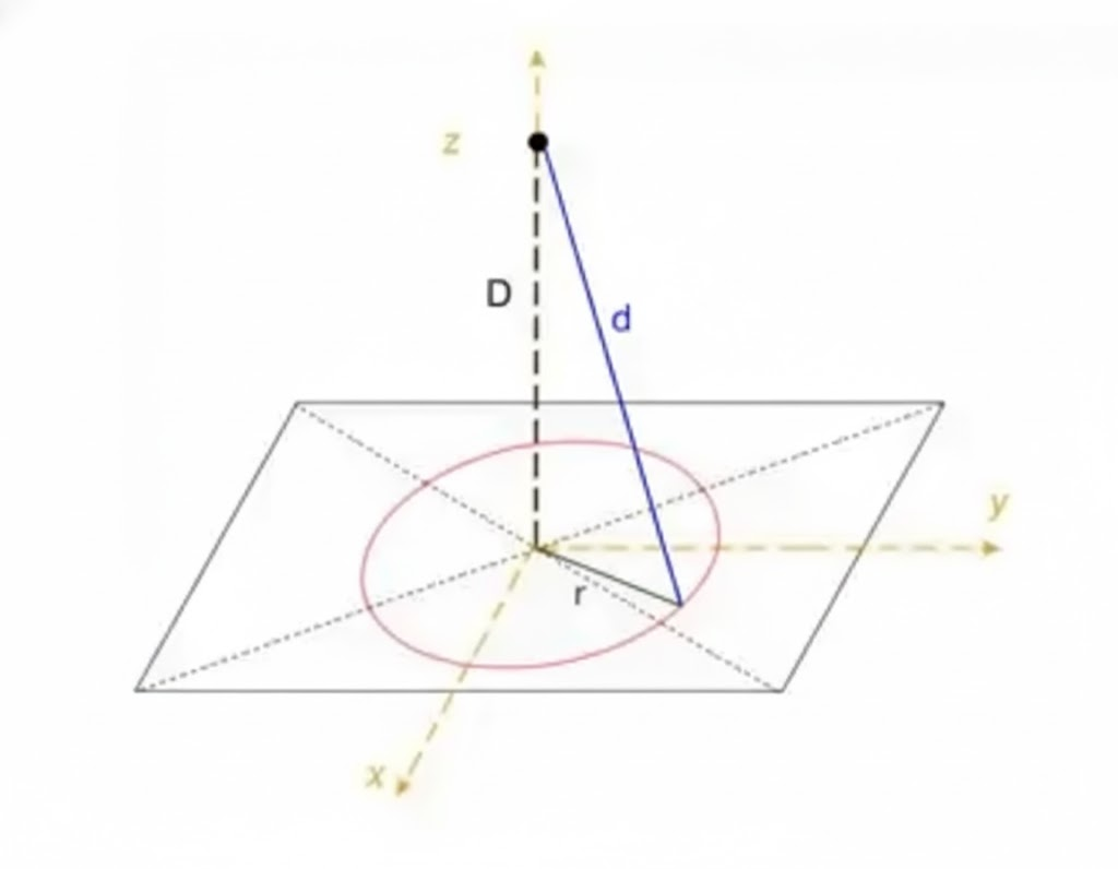A condição “região do plano situada a uma distância \leq 2D do ponto P ” significa que no plano, a distância radial r de P satisfaz r \leq 2D . Mas cuidado: a distância real entre um ponto no plano e P é \sqrt{D^2 + r^2} . A condição \sqrt{D^2 + r^2} \leq 2D implica r \leq \sqrt{(2D)^2 - D^2} = D\sqrt{3} .