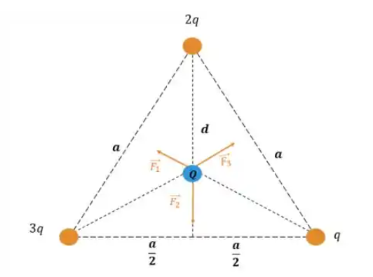 Cargas q, 2q e 3q são colocadas nos vértices de um triângulo equilátero de lado a (fig.). Uma carga Q de mesmo sinal que as outras três é colocada no centro do triângulo. Obtenha a força resultante sobre Q (em módulo, direção e sentido).