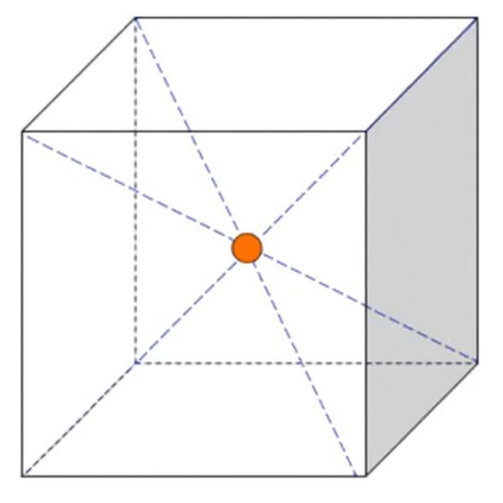 Quando a carga está no centro do cubo, a simetria é esférica. O cubo possui 6 faces idênticas, equidistantes da carga e com o mesmo ângulo entre o campo elétrico (radial) e a normal a cada face. Portanto, o fluxo total se divide igualmente entre as 6 faces: