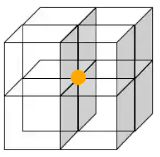 No cubo pequeno que contém a carga em seu vértice, apenas 3 das 6 faces estão orientadas de modo a receber fluxo (aquelas que compartilham o vértice). As outras 3 faces têm fluxo nulo. Como o fluxo se distribui igualmente entre as 3 faces ativas: