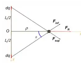 F_x = \frac{q \lambda \rho}{4\pi\varepsilon_0} \cdot \frac{2}{\rho^2} = \frac{q \lambda}{2\pi\varepsilon_0 \rho}Vetorialmente: